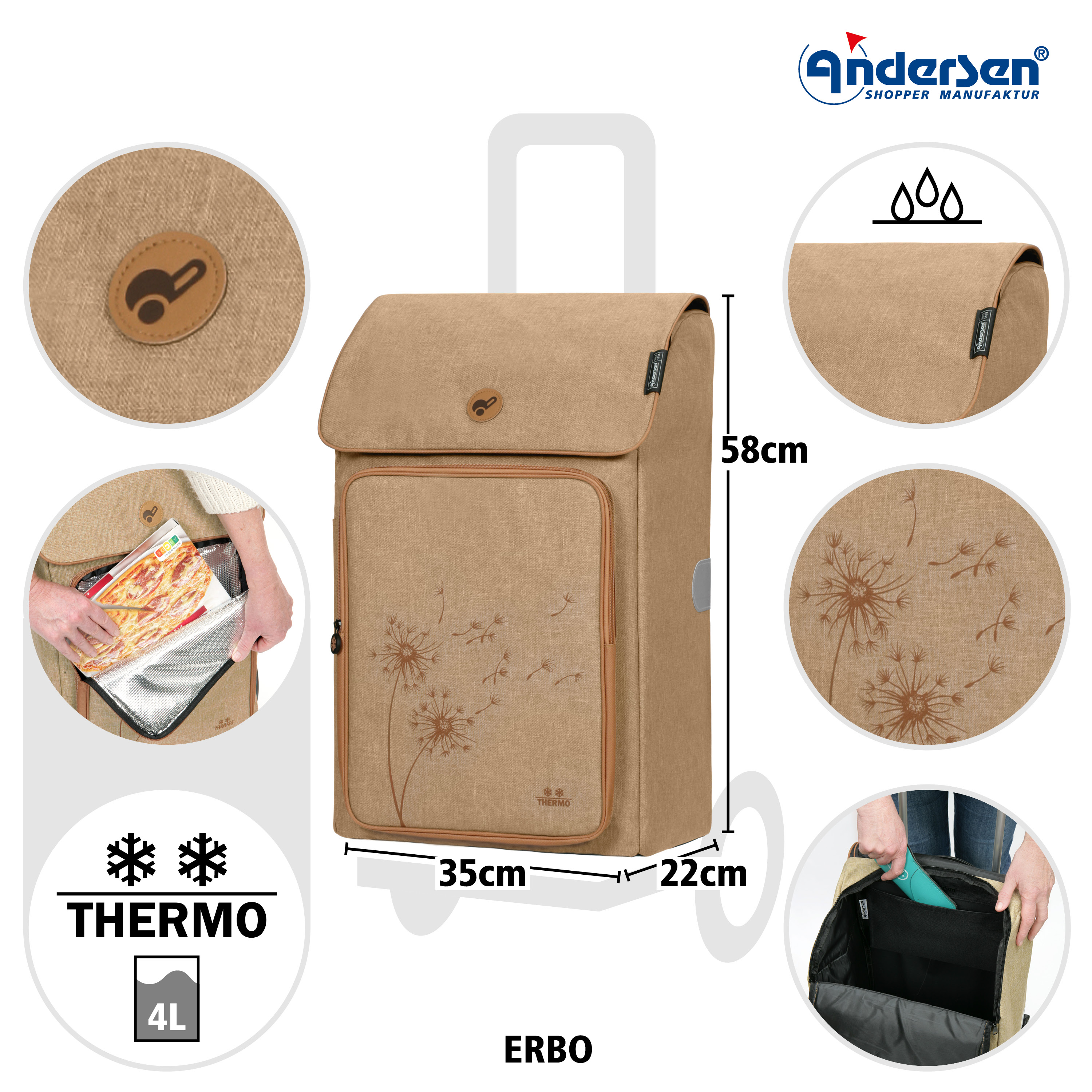 Die Tasche Erbo - geschmackvoll aus meliertem Stoff mit zartem Dessin! Das Thermofach hält den Inhalt frisch, Innen- und Seitentasche sorgen für extra Stauraum. Die moderne Version des praktischen Einkaufsrollers!