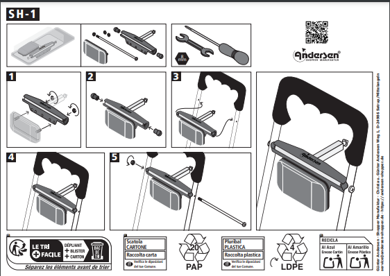Der Kupplungsstift SH-1 ist ein Bestandteil des Andersen Shopper Manufaktur Bike & Easy Systems. Mit Hilfe des Kupplungsstiftes SH-1 kann der Shopper® an der passenden Kupplung befestigt werden. Der Kupplungsstift wird zwischen den beiden Streben des Shopper® Griffes an der entsprechenden vorgebohrten Stelle befestigt. Mit einfachen Handgriffen lässt sich der Shopper® an das Fahrrad ankuppeln oder wieder abnehmen. Der Kupplungsstift kann auch im normalen Gebrauch ohne Fahrrad am Shopper® befestigt bleiben. So kann der Shopper® je nach Belieben entweder mit Fahrrad oder ohne Fahrrad genutzt werden.